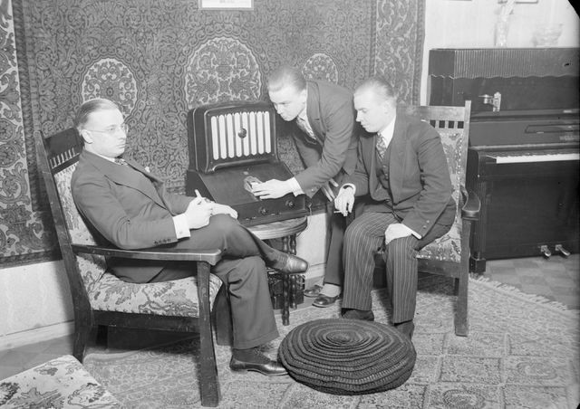 Taiteilijakoti, pianisti Kauno Virtanen (vasemmalla) veljineen kuuntelemassa radiota. Kuva Pietinen, 1931. (C) Museovirasto.