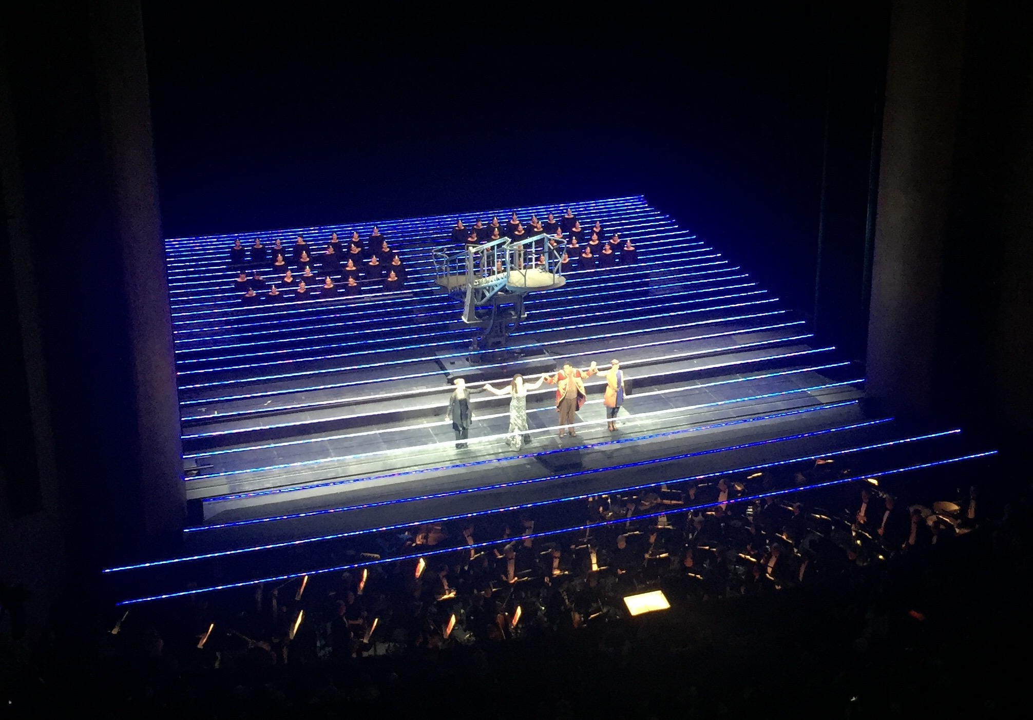 Robert Lepagen ohjaus piti hienosti otteessaan. Näyttämön hallitsevin elementti oli tietokoneohjatuilla Led-valoilla toteutettu alati muotoaan ja sävyjään muuttava meri, jonka aaltojen ja tyventen lomasta L’Amour de loinin tapahtumat kohosivat yhtäältä kiehtovan allegorisina, toisaalta mukaansatempaavan konkreettisina.