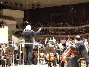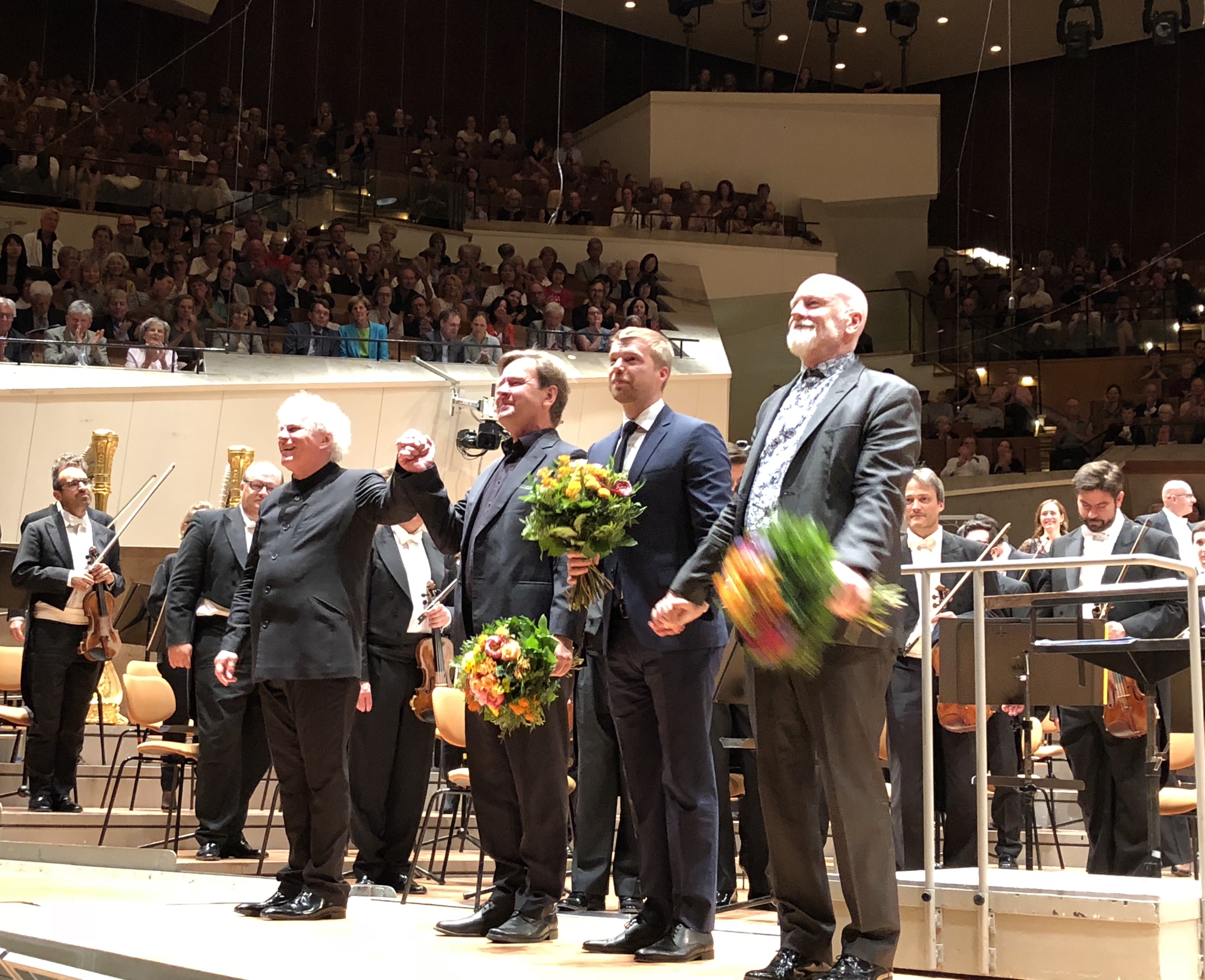 Krystian Zimerman, Berliinin filharmonikot ja Sir Simon Rattle vaikuttavan The Age of Anxietyn jälkeen Philharmoniessa. Kuva © Jari Kallio.