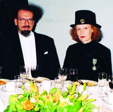 Kaija Saariaho vihittiin Helsingin yliopiston kunniatohtoriksi v. 2018; vasemmalla puoliso Jean-Baptiste Barrière