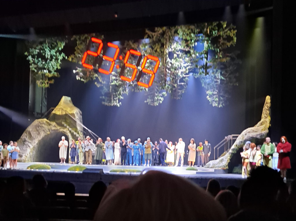 Näyttämötoteutuksella oli keskeinen rooli. En ihan tajunnut pointtia ylösalaisin käännetyissä männyissä muutoin kuin juuri luonnon kriisin symboleina. Olennainen keino on pyörivä lava, joka kuljettaa näytille erilaisia tapauksia, mutta myös saattaa heidät ulos pimeään kalliotunneliin.