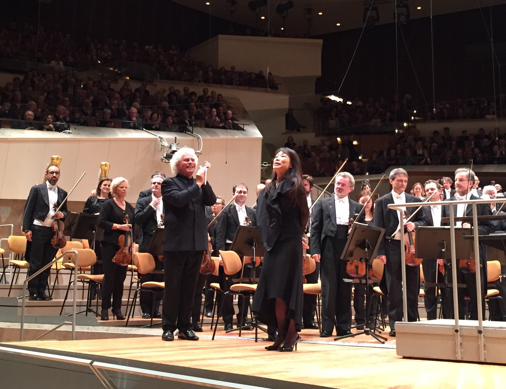 Sir Simon Rattle ja Unsuk Chin Philharmonien lavalla Chorós Chordónin kantaesityksen jälkeen. Kuva © Jari Kallio.