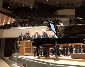 Krystian Zimerman, Berliinin filharmonikot ja Sir Simon Rattle vaikuttavan The Age of Anxietyn jälkeen Philharmoniessa. Kuva © Jari Kallio.