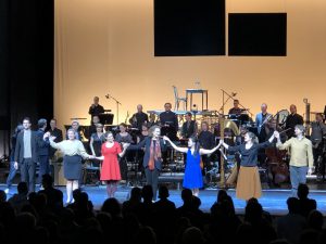 Kaija Saariaho ja La Passion de Simonen esiintyjät Tampere-talon lavalla. Kuva: Jari Kallio