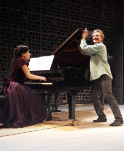 Joka tapauksessa on rohkea ja suorastaan avantgardistinen idea sovittaa Madetojan Juha melodraamaksi. Se vaatii libreton muokkausta, jonka oli tehnyt Suvi Nuotio ja se vaatii musiikin sovittamista, minkä takana oli säveltäjä Ilkka von Boehm, molemmat työssään taidokkaita. Orkesterin tehojen siirtäminen pianolle ei ole helppoa, mutta siinä onnistuttiin: ei tullut edes mieleen, että piano korvasi jotain muuta, piano on oma maailmansa joka kyllä yltää vaikka mihin draamallisiin tehoihin. Se vaatii myös oikean esittäjän. Maria Suokas oli Steinwayn ääressä ja taitaa olla, että koko idea oli suuressa määrin hänestä lähtöisin. Hänen piano-opettajansa Ritva Arjava aikoinaan hämmästeli Marian innostusta melodraamaan, ja nyt hänen kaikki pianistin taitonsa joutuivat käyttöön. Piano ylläpiti koko teoksen monitasoista narratiivia muuntuen antiikin tragedian kuoron myötäelävästä katsojasta itse toiminnan markeeraamiseen, pittoreskiin näyttämökuvaukseen Shemeikan ’hovissa’ ja lopulta roolihenkilöiden tunteiden heijasteluun. Pianisti omaksui myös useampia rooleja, hän esiintyi juonen Marjana, jonka kaulaan kiedottiin viettelevä huivi.