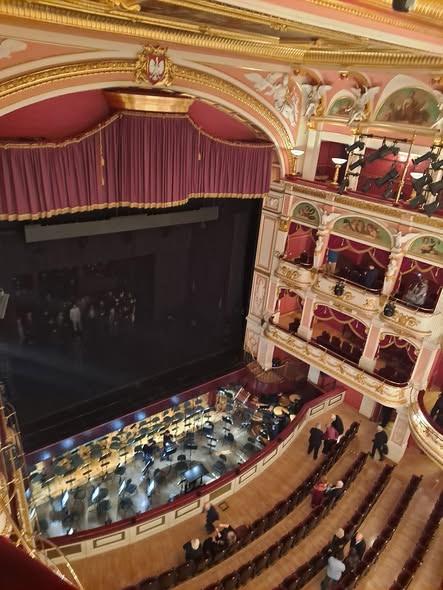 Esitys oli jo alkanut kiivettyämme piippuhyllylle ja kyllä sieltä jotain näkikin. Wrocławin ooppera on sinänsä hieno historiallinen talo, perustettu 1725, näytännöt alkaneet 1755; Carl Maria von Weber johti siellä 18-vuotiaana 1804, Richard Wagner vieraili aikanaan, 1928 esitettiin Schönbergin Die glückliche Hand ja vuodesta 1945 alkaen puolalaista ohjelmistoa kuten Moniuszkon Halka. Koko talo kunnostettiin 1997-2006.