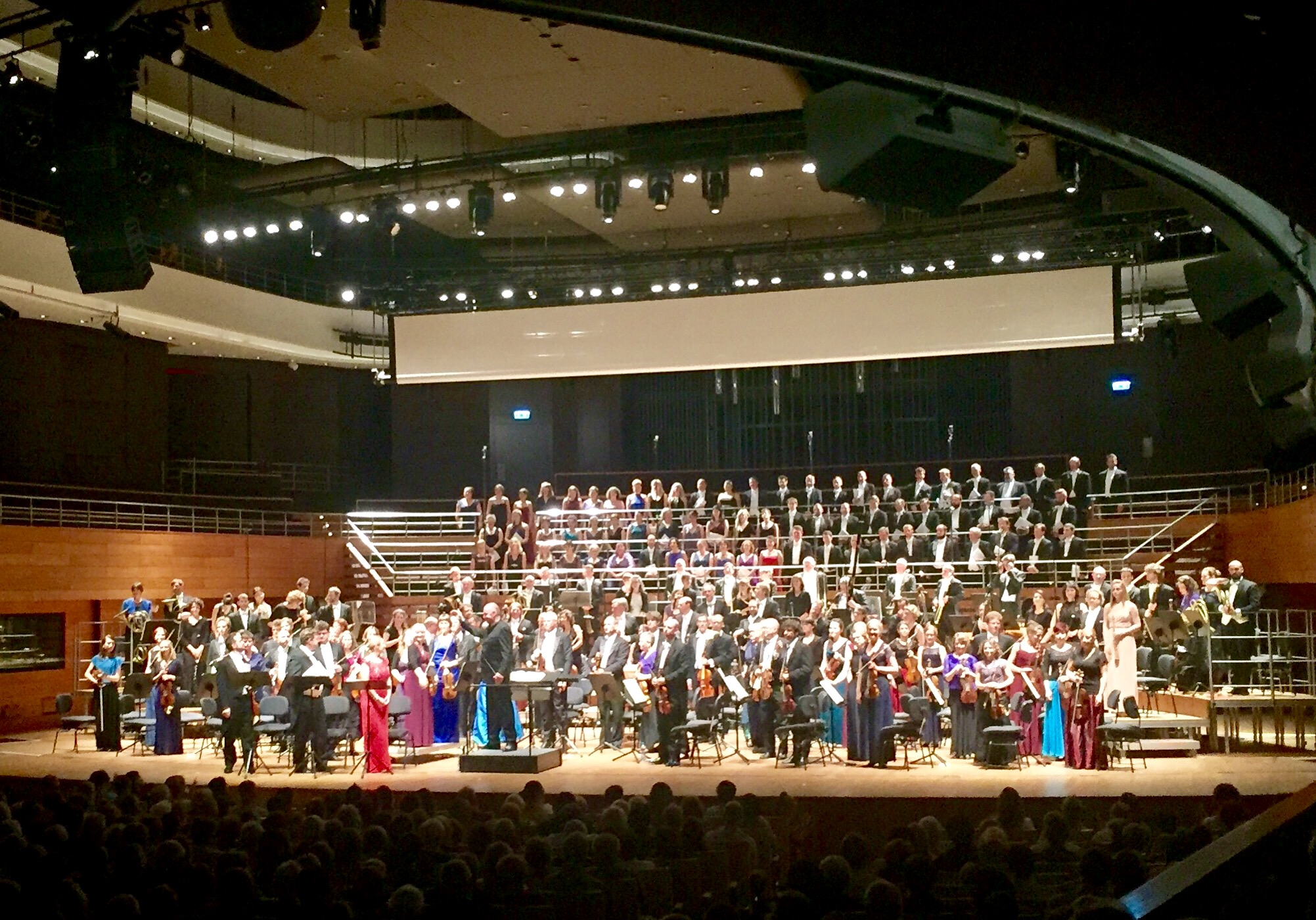 Orkesterin istumajärjestys oli suunniteltu musiikin antifonaalisen luonteen huomioiden. Puupuhaltimet ja käyrätorvet istuivat kahtena kuorona näyttämön kummallakin puolen. Pasuunoiden ja fagottien laajat sektiot oli sijoitettu lavan takaosaan. Tämä sijoittelu palveli musiikin rakennetta erinomaisesti.