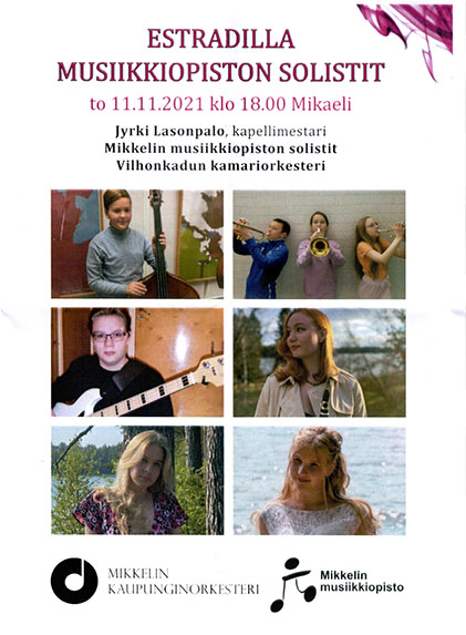 Konsertti Mikaelissa torstaina11.11.2021, Mikkelin musiikkiopiston solistit, Mikkelin kaupunginorkesteri ja Vilhonkadun kamariorkesteri Jyrki Lasonpalon johdolla