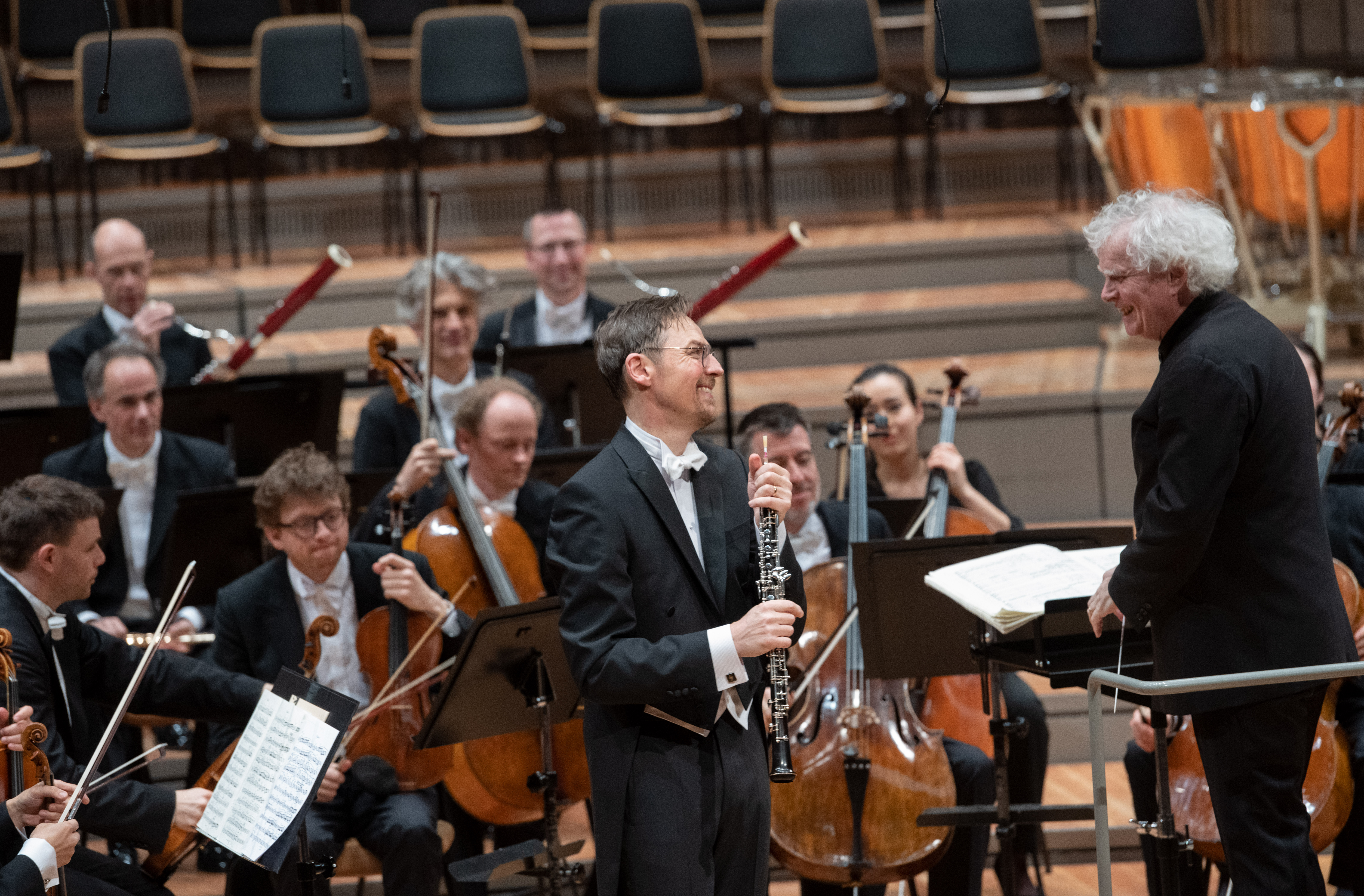 Jonathan Kelly, Sir Simon Rattle ja Berliinin filharmonikot Straussin oboekonserton jälkeen. Kuva: Monika Rittershaus