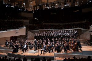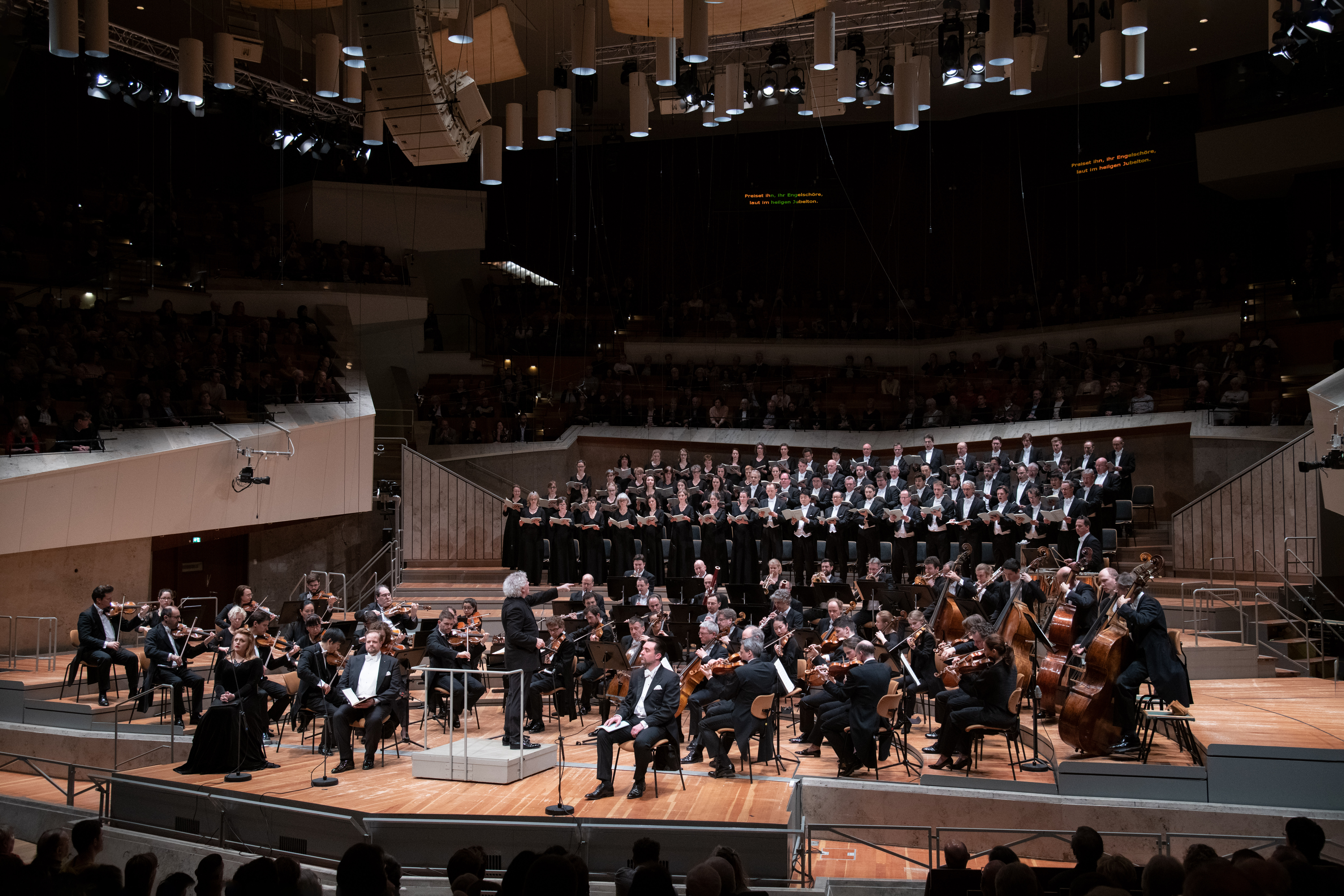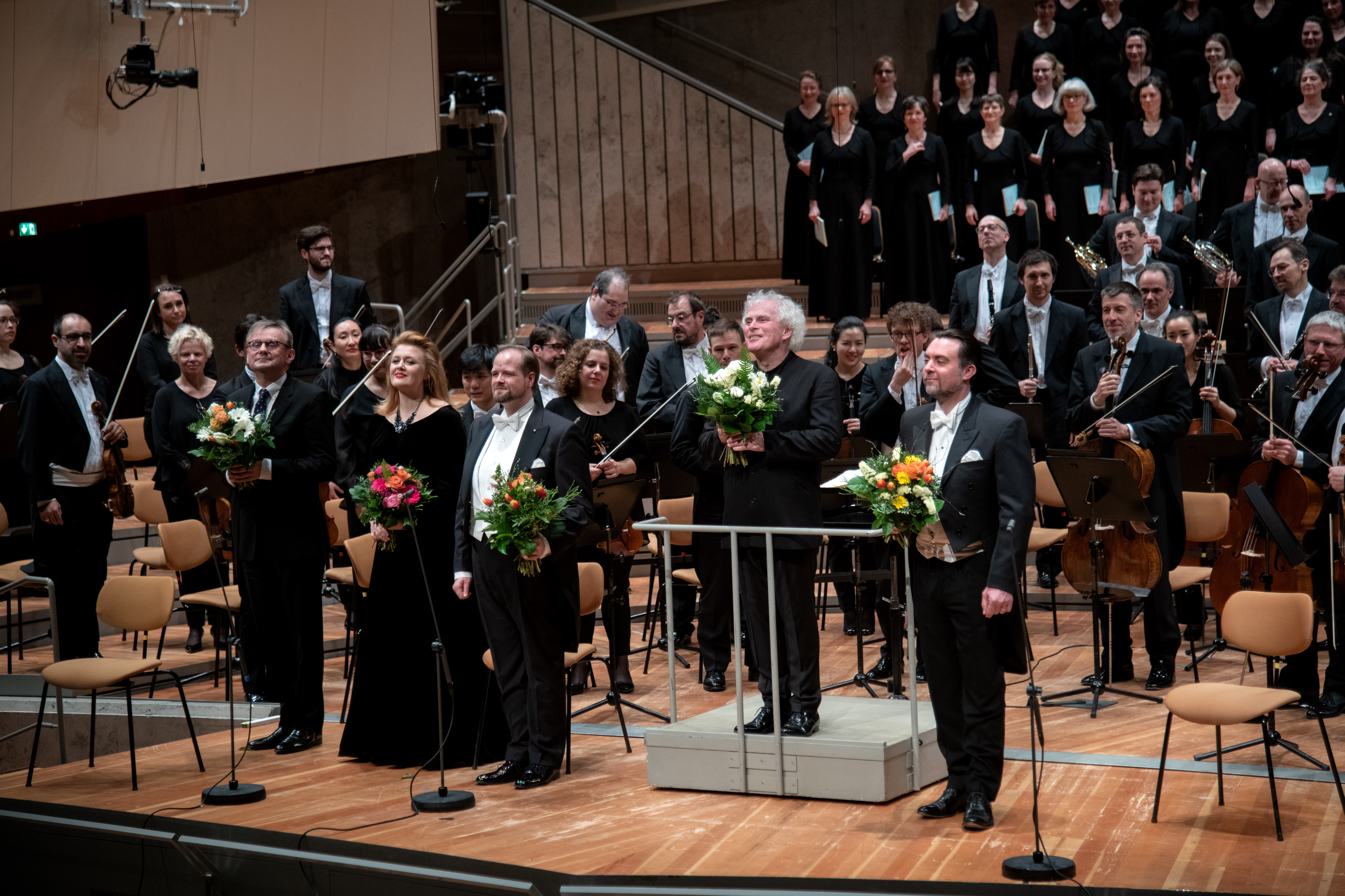 Iwona Sobotka, Benjamin Bruns, Sir Simon Rattle ja David soar Philharmonien lavalla Berliinin filharmonikoiden ja Rundfubkchor Berlinin kanssa. Kuva: Monika Rittershaus