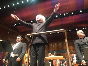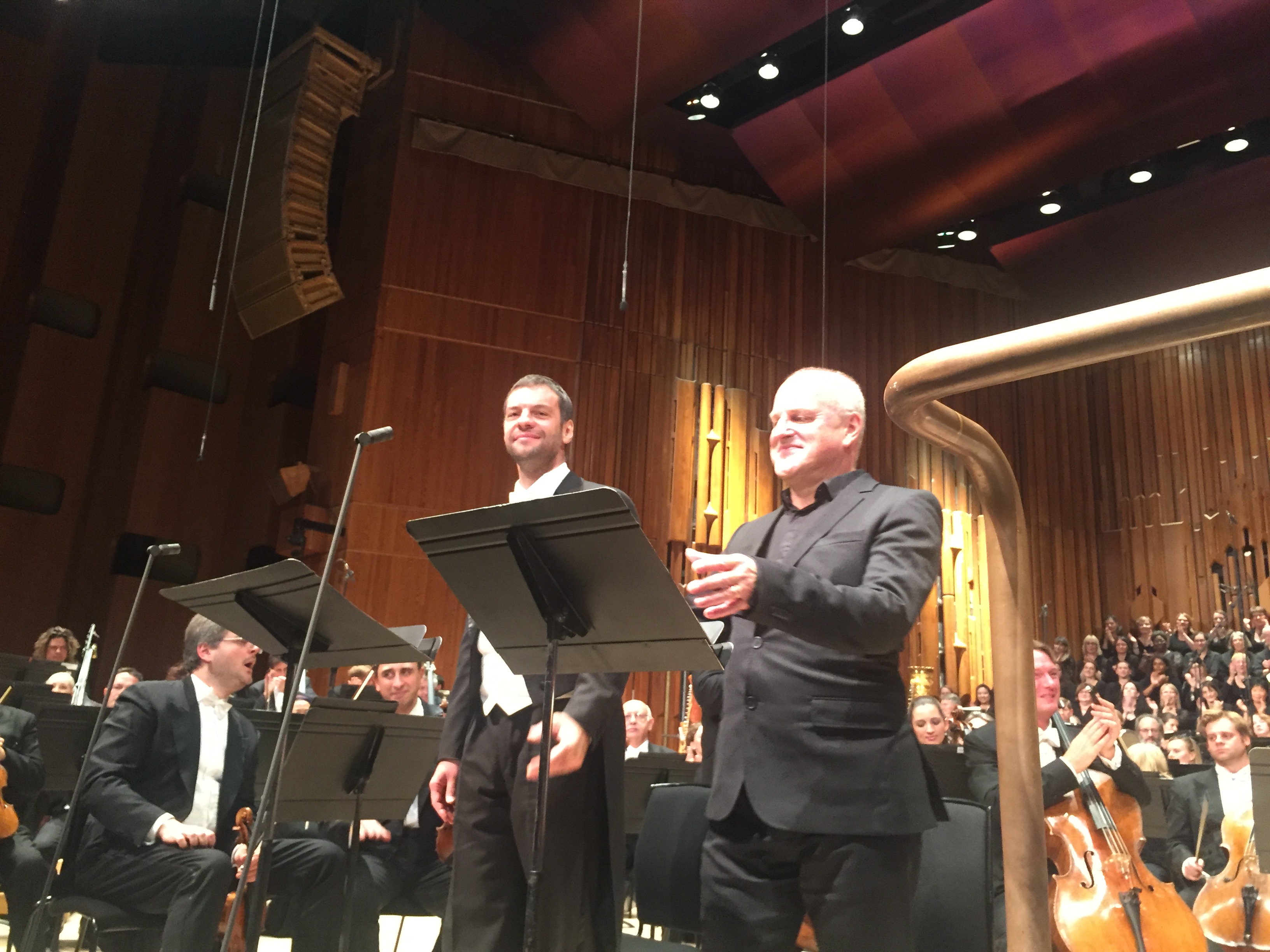 Sir Simon Rattle, Bryan Hymel (Faust) ja Christopher Purves (Méphistophélés) Barbicanissa sunnuntaina. Kuva Jari Kallio.