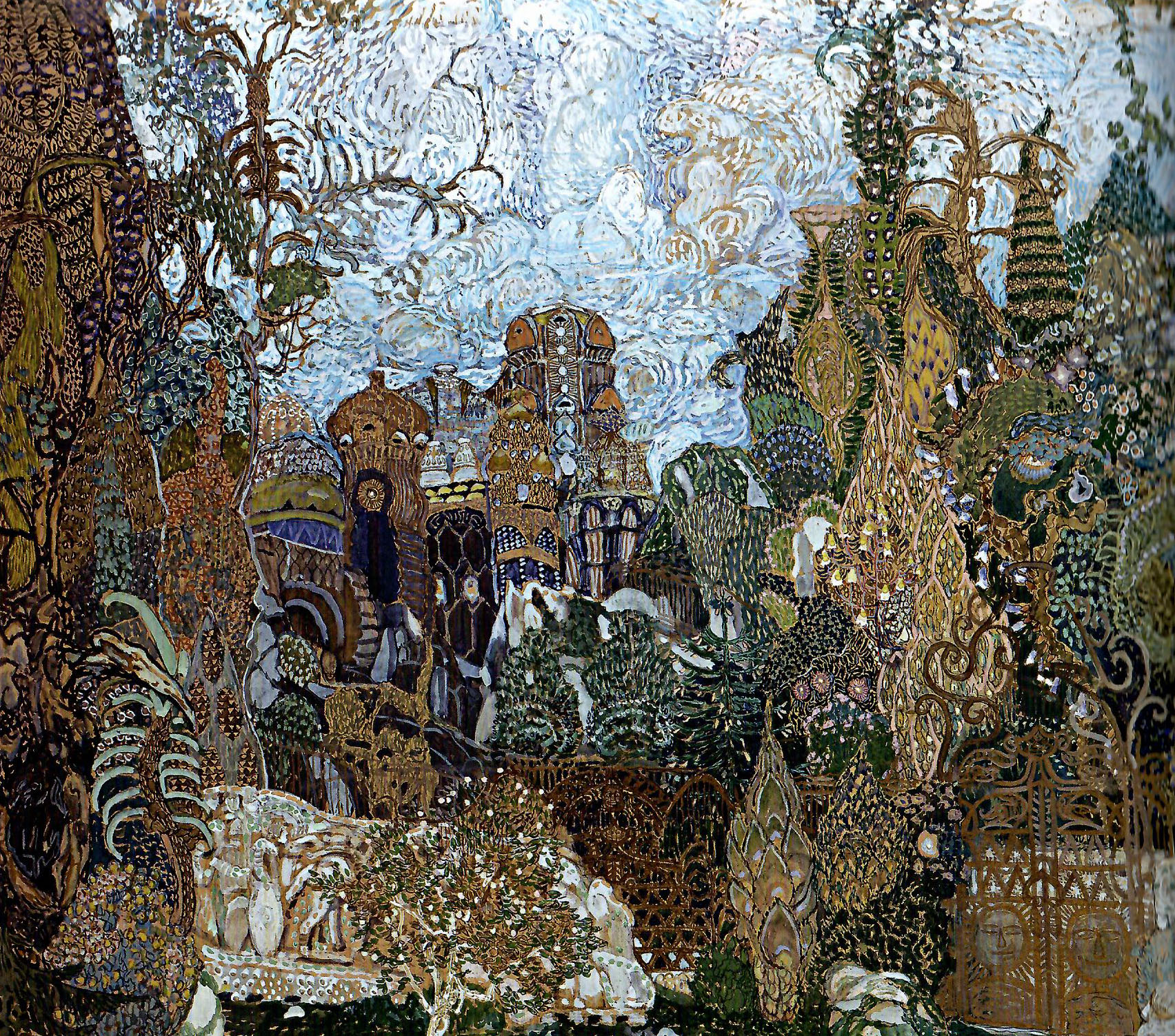 Aleksandr Golovin: Koštšein valtakunta (1910). Luonnos Igor Stravinskyn Tulilintun-baletin lavasteeksi.
