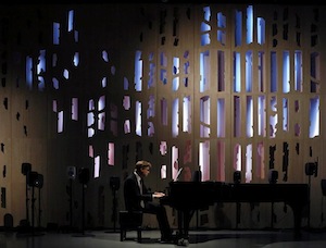 Museon toiseen kerrokseen astuttaessa vastassa oli kaikuisa holvikäytävän halkoma sali, jonka leveässä päädyssä tipitti kolmisenkymmentä pientä mustaa kaiutinta mustien keppien nokassa, sekä muutama isompi toistamaan pata- ja isorumpujen kumahduksia. Se oli mustasuinen kaiutinorkesteri. Edessä oli kanneton flyygeli, ja takana systemaattisesti rei’itetty koko seinän peittävä näyttävä puinen reliefi.