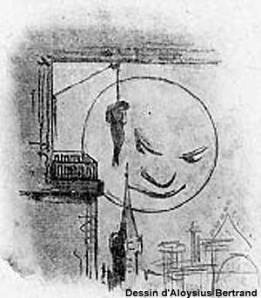 Bertrandin runossa hirtetty puolestaan on koko ajan läsnä kammottavana pääteemana, alati taustalla kaikuvana aavemaisena motiivina, jota pikkuruiset yksityiskohdat kiertävät ja kaartavat: muratti kietoutuu hirsipuun ympärille, kuoriainen poimii verisestä kallosta hiuksen ja hämähäkki kutoo kuolleelle musliinikauluksen. Koko runo miniatyyristen yksityiskohtien luetteloineen on rakennettu kysymysten muotoon: puhuja etsii vastausta häiritsevään, uhkaavaan aavistukseen, kyselemällä ”Mitä se oli? Olisiko se…?” Kysymysmuoto on omiaan nostattavan saman jännitteen, jonka Ravel luo kello-ostinatolla. Lopulta ”vastaus”, kaamivan tunteen aiheuttaja, paljastuu: ” Mutta se oli kello joka kumajaa kaupungin muureilla näköpiirin rajalla, ja hirtetyn ruho jota laskeva aurinko punaa.” ”Hirsipuu”-runossa kirkonkello ja sen kammottavuus siis paljastetaan vasta aivan lopussa.