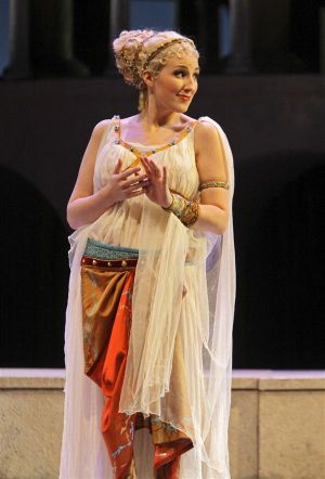 Hanna Rantala. Kuva: Heikki Tuuli.Riemastuttavan näyttämöllepanon olisi kruunannut paneutuvampi kuviolaulu ja ehkä joiltain osin erilainen roolitus. Upeaa tietenkin on, että huolimatta teoksen vaatimasta 14 solistista, kahta ”ulkomaanvahvistusta” lukuunottamatta solistikaarti on kokonaan kotimaista tekoa. Jos ei joka rooliin löytynyt aivan napakymppiä, ilonaiheita löytyy: ensimmäisessä ensi-illassa Hanna Rantala lauloi vangitsevasti Corinnan vaativan roolin ja onnistui kaikin puolin hienosti Apollon tyttärenä Darion teatterissa; italialainen Filippo Adami (Libenskofin kreivi) ja meksikolainen Noé Colín (Don Profondo) ovat mainioita rooleissaan niin laulullisesti kuin näyttämöllisesti – kuin myös kokeneet Aki Alamikkotervo (Ritari Belfiore), Jaakko Kortekangas (Trombonokin paroni) ja Tiina Vahevaara (Follevillen kreivitär); ja kyllä Markus Niemisen (Don Alvaro) komeaa bassobaritonia kelpaa kuunnella. Ensimmäisessä roolituksessa oli kuitenkin myös ikävää epätasaisuutta.