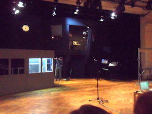 Lavastus muodostikin eräänlaisen kuunnelmastudion äänieristettyine ikkunallisine koppeineen (mieleen tuli TV-klassikko Kymppitonni), lavasteikkunoineen ja teatteriportaineen. Yksi näyttelijöistä operoi mikrofonia, jolla näytelmä näytelmässä -teoksen äänimaisema luotiin yleisön edessä: kankaan huljuttelun ääniä, ikkunan narinaa, kahvinkeittimen porinaa, pianistin pedaalityöskentelyä… Lavan etuosassa selkä yleisöön päin olleen ääniteknikon vieressä yksi näyttelijä ikään kuin ohjasi kuunnelmaa. Yleisön yläpuolelle oli lisäksi sijoitettu lähes huomaamattomia pieniä kaiuttimia, joilla luotiin erääseen kohtaukseen ovelasti kolmiulotteinen kaskaiden laulu -äänimaisema.