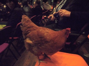 Yleisö ympäröi kolmelta sivulta piskuisen salin keskellä olevan näyttämön, jonka muodostaa valtava keittiönpöytä juureksineen ja keittolevyllä herkullisentuoksuisesti kiehuvine patoineen; neljännellä sivulla on orkesteri läpinäkyvän sermin takana. Pöydän alta lähtee seikkailemaan paikoilleen asettuvan yleisön sekaan ihkaelävä kana, joka hetkeksi jopa istahtaa vierustoverikseni (ks. kuva). Ooppera alkaa Bejljan hakiessa kukon pois huudahduksen ”Mitä sinä täällä teet?” saattelemana. Suu virneessä istuvan yleisön huomio on saatu.