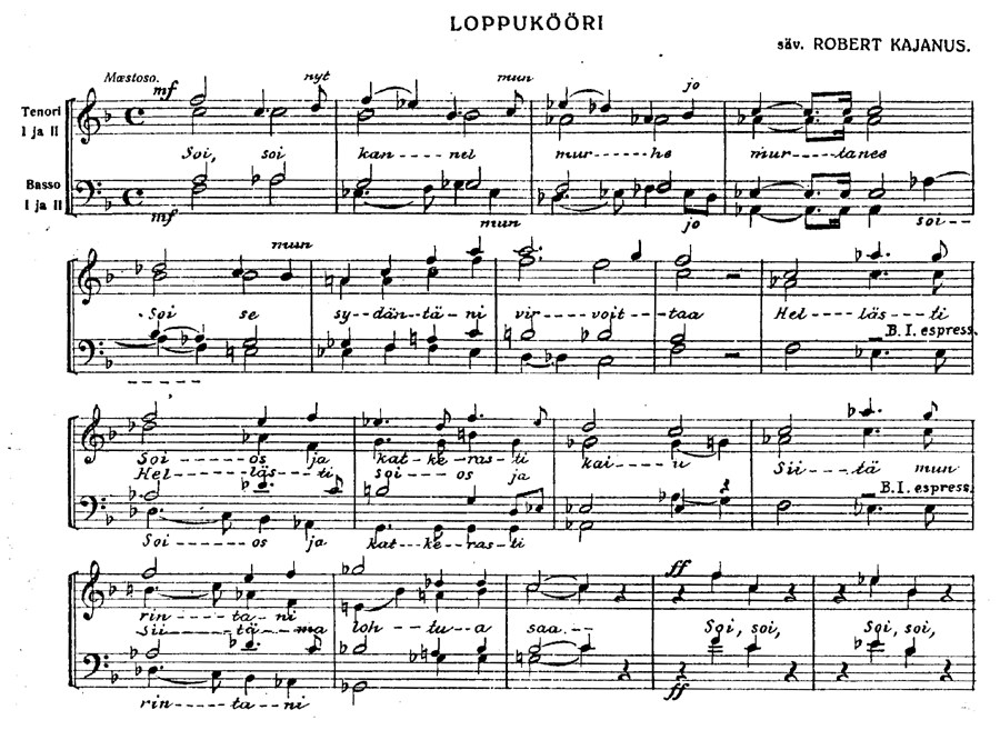 Mainittakoon, etteivät tähän näkemykseen olet yhtyneet myöhemmät musiikintutkijat -Heikki Klemettiä lukuunottamatta. Kajanus siis halusi erottua saksalaisesta tyylistä jonain puhtaasti suomalaisena.Hän sovitti Runebergin itsensä laatiman sävelmän, jonka tämä oli antanut porvoolaisen musiikinopettaja Carl Frans Blomin muokata neliääniseksi kvartetiksi 1846. Kajanus muunsi sen Akademiska Sångföreningenille sopivaksi puolestaan kuoron 90-vuotisjuhliin 1930.