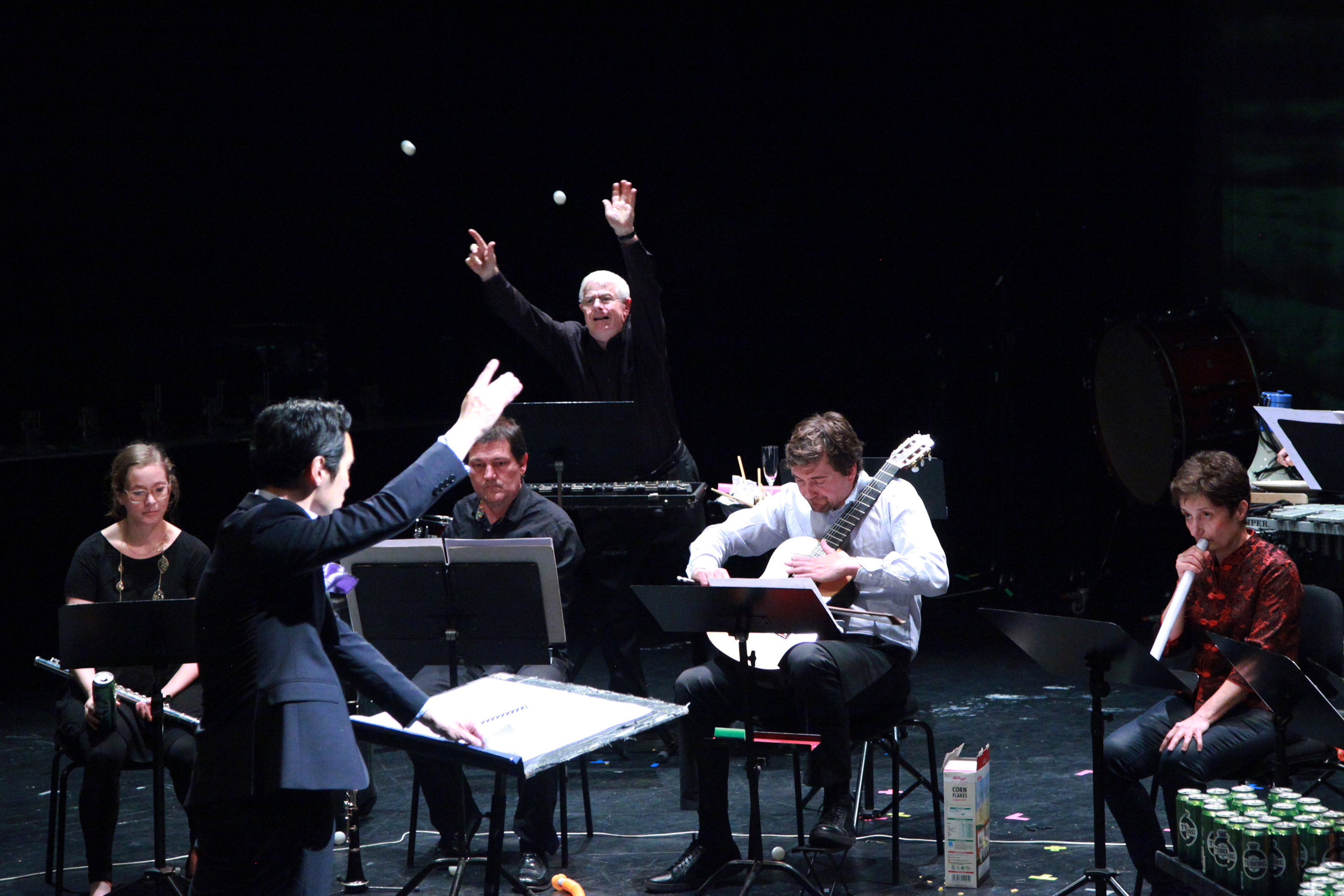 Näillä ja muilla yhtä arkipäivän surrealistisilla lauseilla alkoi minun osaltani viimeinen festivaalipäivä. Niin totta kuin Klangilla on kaksi taiteellista johtajaa, tämän vuoden festivaalin yksi pääpiirteistä on kahden yhtyeen voimien yhdistäminen. Ensin Poing! ja Figura, sitten pariisilainen Ensemble Aleph ja Curious Chamber Players -yhtye, joka on ahkerimmin tuonut esinetaiteen soinnillisen puolen nykymusiikkikentän huulille. Jos arki on musiikkia, jokapäiväiset, helposti ylenkatsotut esineet ovat vahvan äänipotentiaalin omaavia soittimia.