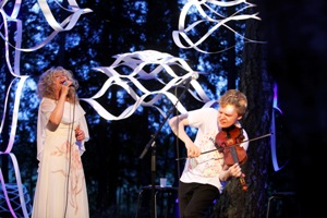 Anna-Mari Kähärä ja Pekka Kuusisto esittivät siis illalla Ainolan metsässä kokoelman omia teoksiaan, joiden sanoitukset jotenkin käsittelivät meriaiheita tai peräti juurikin Itämeren tilaa. Silloin kun sanoituksissa ajauduttiin lähelle banaalia, vapautunut ja paikoin rohkean kosiskelematonkin musisointi etäännytti virkistävästi. Hupaisat rupattelut ja hölmöilyt numeroiden välissä viihdyttivät metsäiselle rinteelle kokoontunutta satapäistä yleisöä makeisiin nauruihin asti, ja Marko Myöhäsen loihtima ulkoäänentoisto toimi ihailtavan hyvin.