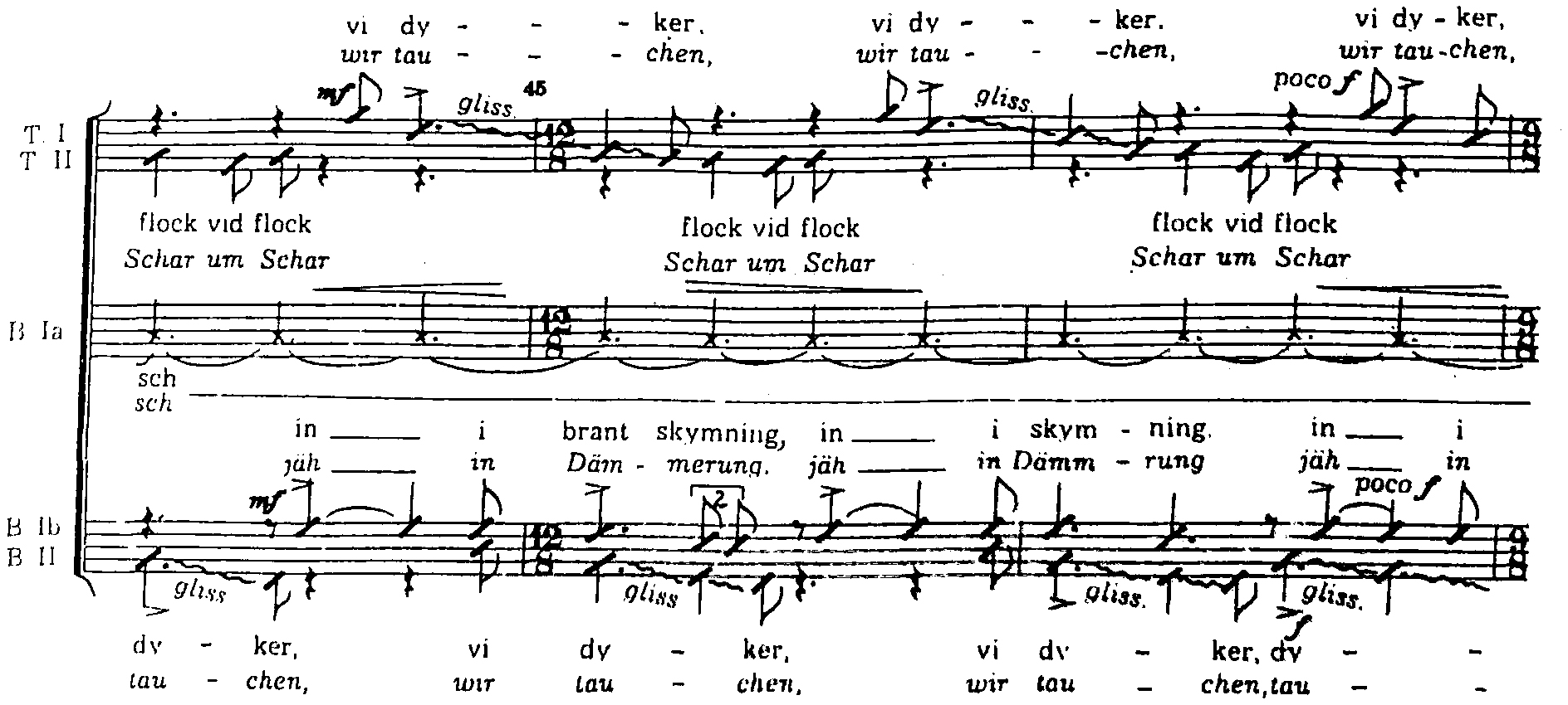 Mieskuorosäveltäjistä Erik Bergmanin (1911-2006) laajassa kuorotuotannossa ajalle tyypillinen modernismi on hyvin edustettuna. Suomalaisittain avartavaa sekakuorosävellystä ”4 Galgenlieder” (1960) välittömästi seuraavassa mieskuoroteoksessa ”Bauta” (1961) Bergman hyödyntää ilmaisuvoimaisia harmonioita ja viitteellisesti notatoitua puhekuoroa sekä vuotta myöhemmässä sävellyksessä, ”Fåglarna” (1962) samoin mieskuorolle, myös laajoja klustereita.